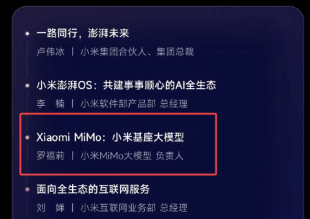 伟冰等人将在主论坛发言,刚刚加入小米的罗福莉也将进行首秀,日程表显示,其职位为MiMo大模型负责人。
