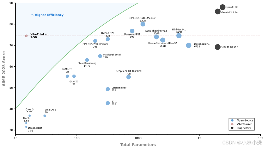 (1)打破了“参数越多越聪明”的固有认知:之前大家都觉得推理能力必须靠大参数,但VibeThinker-1.5B用仅1.5B参数就达到了几百B参数模型的水平。