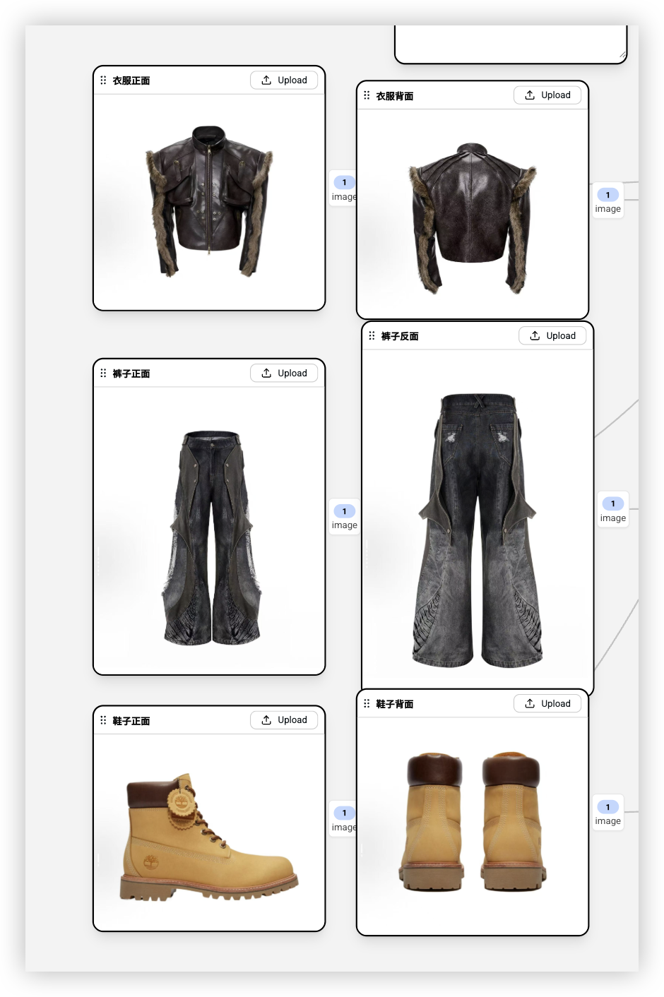 在一个相对完整的虚拟试穿工作流里,通常会把衣服的前后、上下身分开输入,比如上衣正面和背面、裤子正面和背面、鞋子正面和背面。