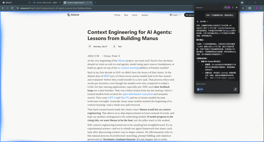 经过上述一顿操作之后,重启浏览器,如果顺利的话,你会看到浏览器顶部的Gemini图标,这时候你就可以愉快使用Gemini in Chrome功能了。看官方的描述,目前好像还仅对于Google AI Pro用户开放,所以如果经过上述一通操作后还是没有在浏览器上找到Gemini小图标,那可能还得再等一等,或者立刻给Google打钱。