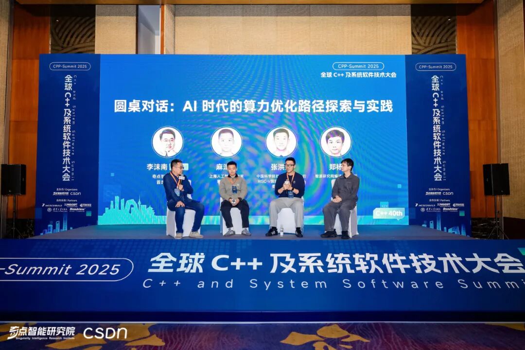 紧接着,在圆桌对话环节,由奇点智能研究院首席咨询师李沫南担任主持,北京智源人工智能研究院编译器研究员郑杨,上海人工智能实验室青年研究员麻津铭,中国科学院软件研究所博士后、RISC-V 国际基金会技术指导委员会委员张洪滨齐聚一堂,围绕“AI 时代的算力优化路径探索与实践”这一主题,从软件、硬件、编译、生态等多个维度展开讨论,共同探索 AI 算力高效利用的实现路径与实践方向。