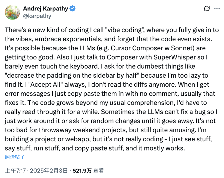 今年我用 Vibe 编程实现了很多项目,作为快速应用演示,来验证我想要存在的功能(例如 menugen、llm-council、reader3、HN 时间胶囊)。我甚至用 Vibe 编程快速生成了整个短生命周期应用,只为了找出一个 bug——为什么不呢?代码突然变得自由、短暂、可塑、一次性可丢弃。